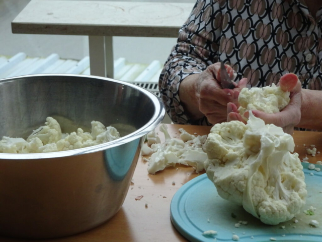 Beim Gemüse schneiden waren alle Bewohner mit Freude dabei.