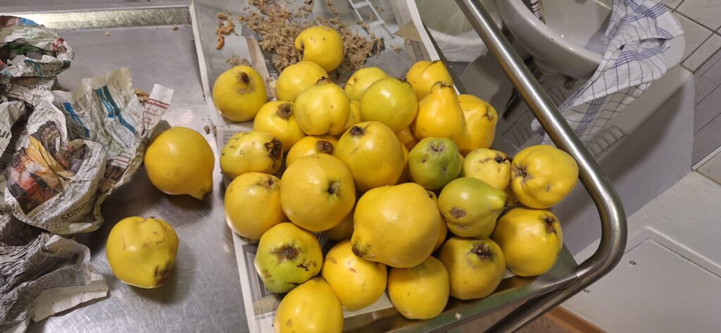 Ein typisches Obst zum späten Herbst ist die Quitte. Diese wurden mit Hilfe vieler Hände bei uns an mehreren Nachmittagen verarbeitet. Das Ergebnis waren viele Gläser mit leckerem Quittengelee, was das Frühstück bereichert und leckerer Quittensirup. Die viele arbeit und Mühe hat sich gelohnt.